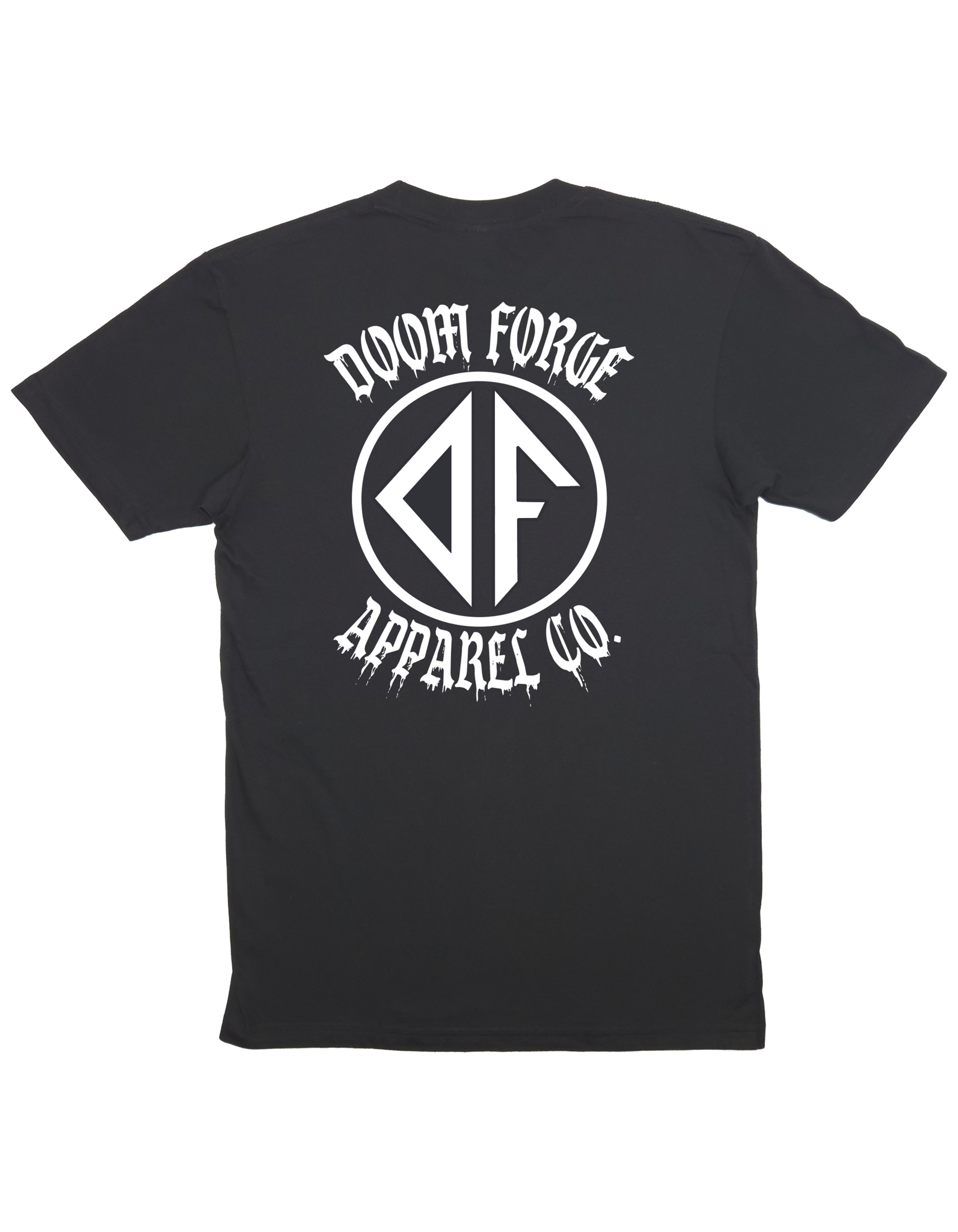 Minimal up front, mayhem in the back. This black tee features a small DF circle logo on the chest and a full back print that reps Doom Forge Apparel Co. in raw, Old English lettering. Built for the pit, the gym, or wherever you bring the chaos.