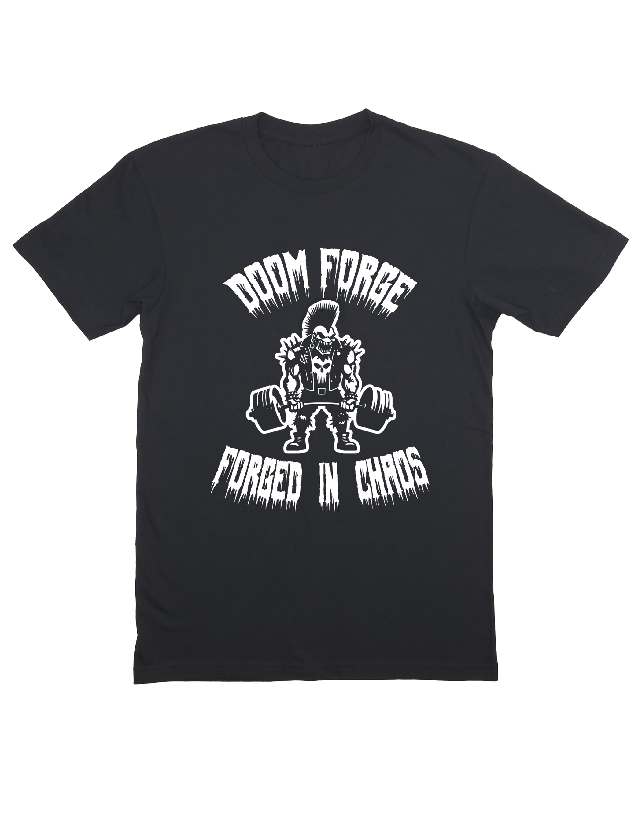 Lift heavy. Look unhinged. This tee features a mohawked, Monster lifter flanked by barbell carnage with DOOM FORGE overhead and FORGE IN CHAOS below. For the ones who train like it's the end of the world.