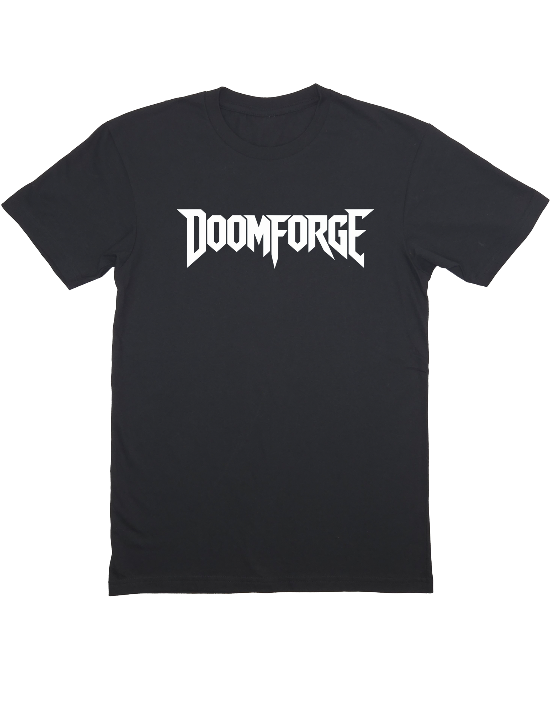 No frills. No mercy. One-line DOOMFORGE print in a font forged straight from the fires of classic metal—clean, sharp, and built to shred.